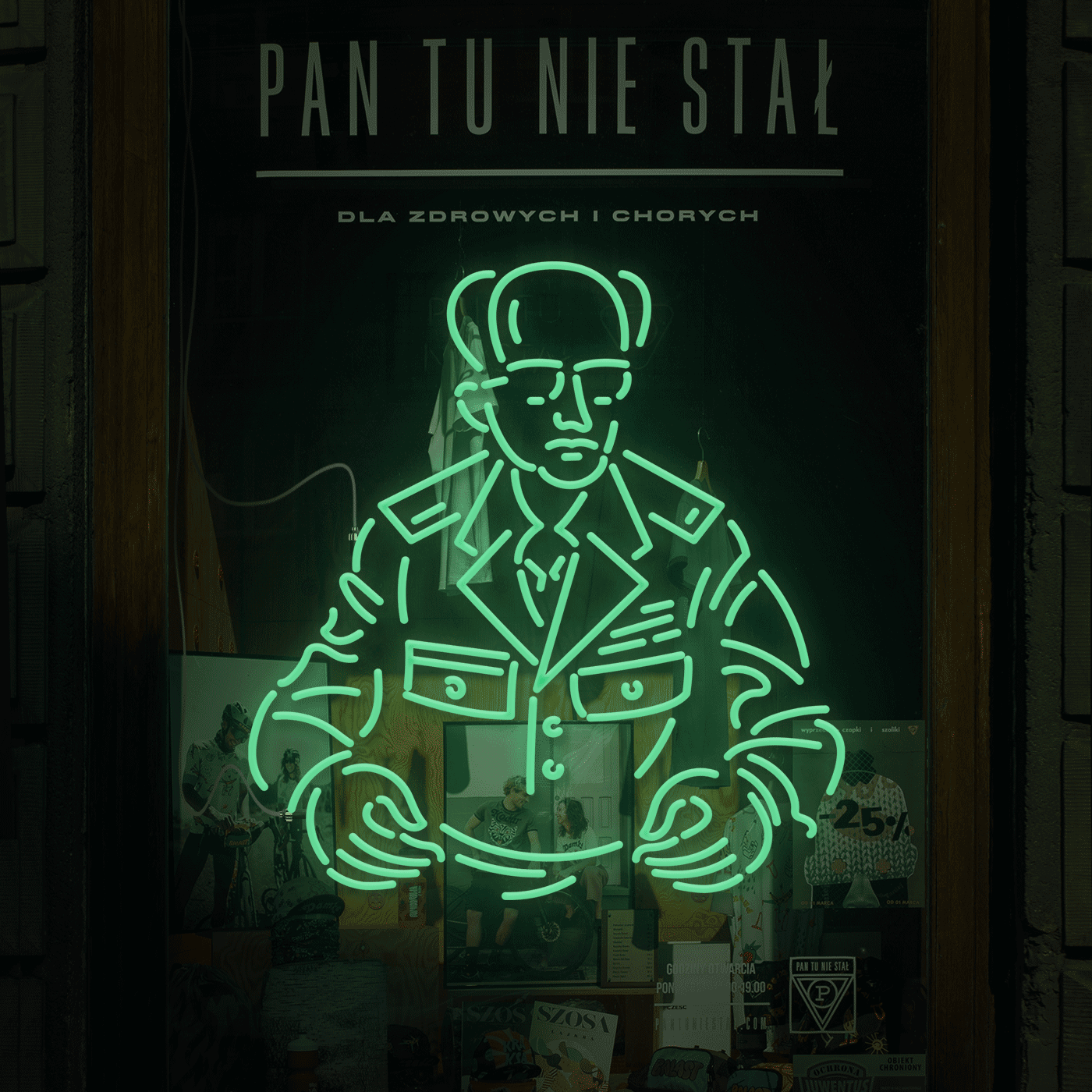 Konkurs na neon dla Pan Tu Nie Stał. Sklepy marki nawiązują do stylistyki PRL, a neon musiał ograniczać się do dwóch kolorów. Dlatego powstał „zielono-czerwony”. Projekt wyróżniony. Niemal wygrał konkurs. Rola: projekt neonu.